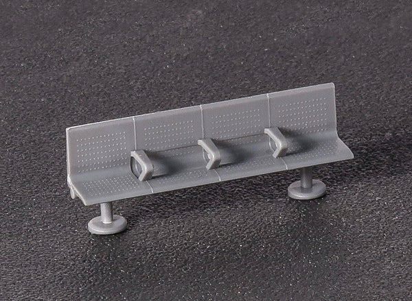 This style of modern seating is prevalent across all stations in the UK now, and no doubt they can be found elsewhere around the world. In OO/HO scale the kits comprise of two parts that need to be glued together. The modeller will need to paint them, and there are a number of colour options suitable, according to their location. The seats are mounted into the platform surface once a small hole has been drilled to accept the seat supports. Each pack contains 12 seats.