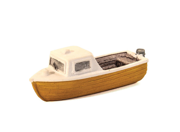 Ungefähre Größe 53 mm x 18 mm. Ein kleines Boot zum Angeln oder in der Freizeit, ideal für eine Kai-, See- oder Flussszene oder als Anhängerladung für ein Straßenfahrzeug. Das Harburn Hamlet-Sortiment an bemaltem Harzzubehör bietet interessante landschaftliche Details für die Umgebung des Kais auf Ihrer Anlage.