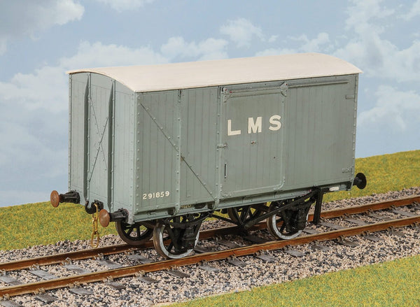 Gebaut von der LMS, die zwischen 1924 und 1926 über 2.500 Exemplare produzierte. Midland Railway-Design mit 9-Fuß-Stahlfahrgestell. Dauerte bis in die frühen 1960er Jahre. Transfers für LMS und BR. Diese fein geformten Wagenbausätze aus Kunststoff werden komplett mit Rädern und Lagern mit Steckachse, 3-Glieder-Kupplungen und Transfervorrichtungen geliefert. Dieser Bausatz wird mit vorgefärbten Formteilen geliefert, obwohl das Erscheinungsbild durch Lackieren verbessert werden kann. Gegebenenfalls sind zusätzliche Teile enthalten, die eine Modellierung des Fahrzeugs unter Einbeziehung von Modifikationen ermöglichen, die an den Prototypen während ihrer Nutzungsdauer vorgenommen wurden.