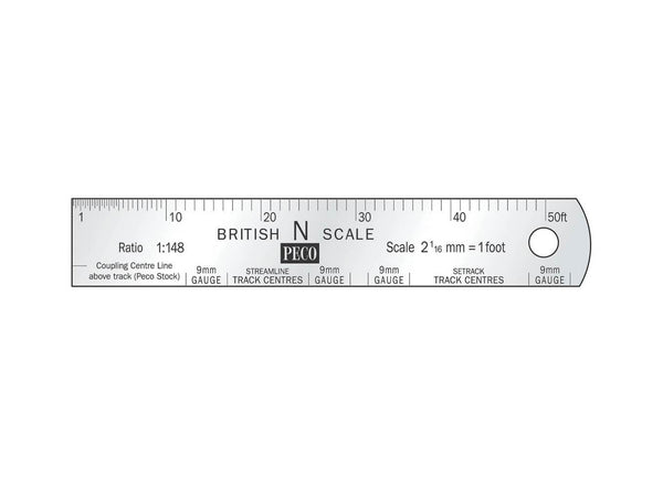 This stainless steel scale rule is a valuable tool for modelling in British N Gauge. It shows scale measurements from 3ins to 50ft, marked at 1:148 scale. It also includes markings for track gauge and spacing.